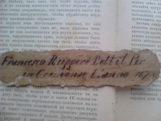 Доброго времени суток всем. Не думала раньше что когда-то напишу в этой теме, но все бывает)) Мне в руки попал инструмент с вот таким этикетом... Как, собственно, возможно определить соответствие этикета написаному? Цвет лака, форма эф, эсок, ус, голова, шейка во многом соответствуют описанию инструментов семейства этого мастера, но сомнения не покидают))). Сейчас скрипка на реставрации у мастера, мы с интересом ожидаем какой будет звук (ко мне попала практически целой но с небольшими "протертостями" лака, пара мест где отходила верхняя дека, и без верхнего порожка и пуговицы, ну и в грязноватом виде). Заранее благодарю за ответы!