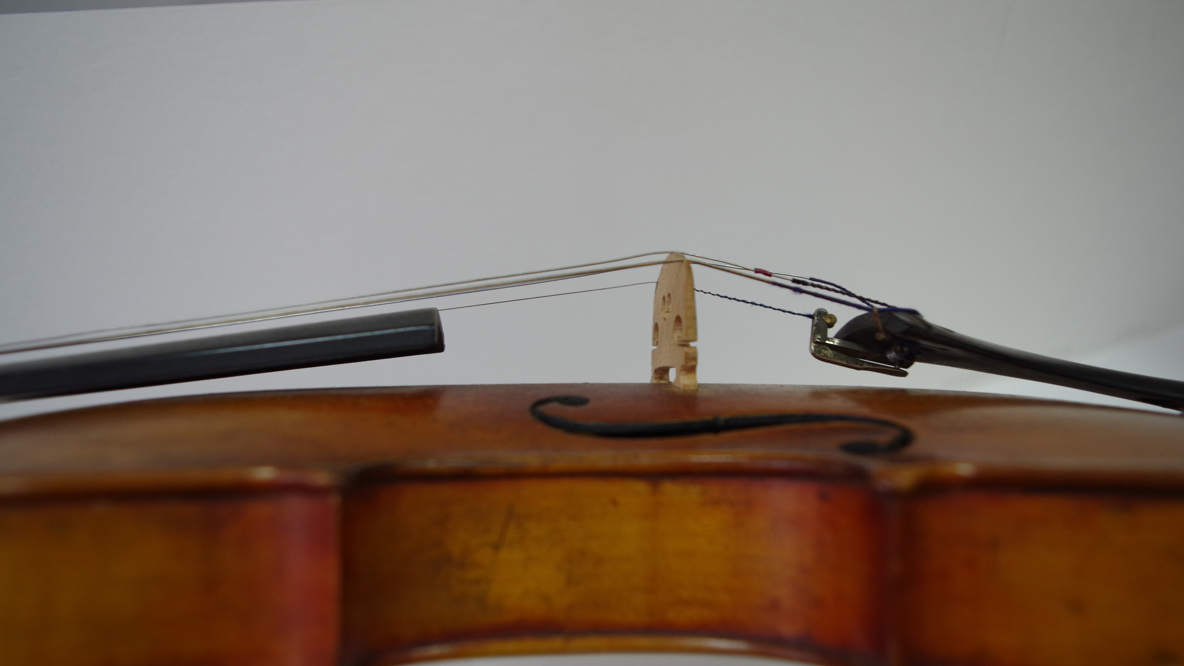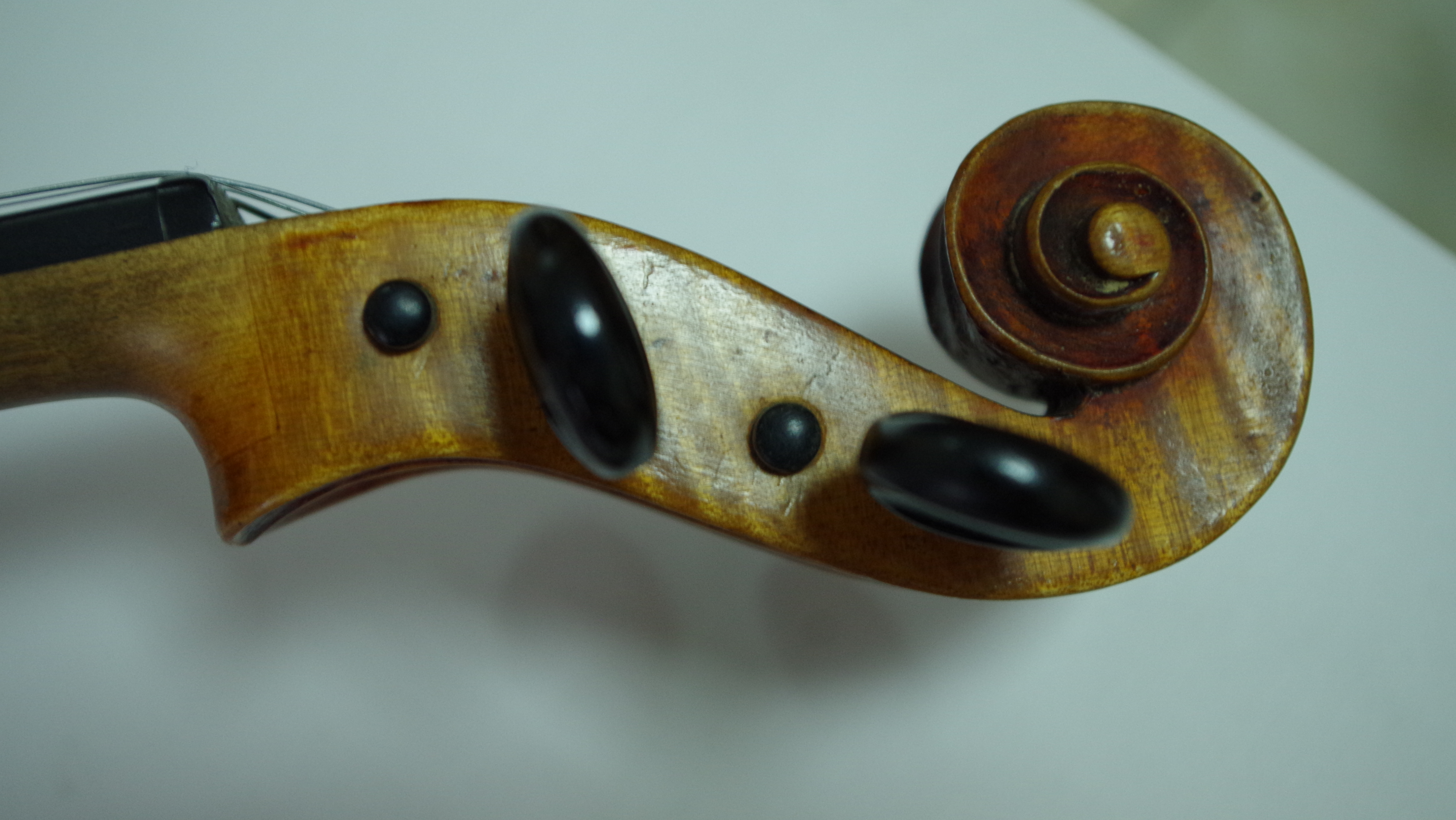 Я не скрипачка, не очень понимаю. С советские времена заменили только центральную деку, так наверное. Струны расстроены, одна натянута. Тянуть не рискую. Но та что натянута, самая нижняя... Очень поет..... Хоть и не тугая.