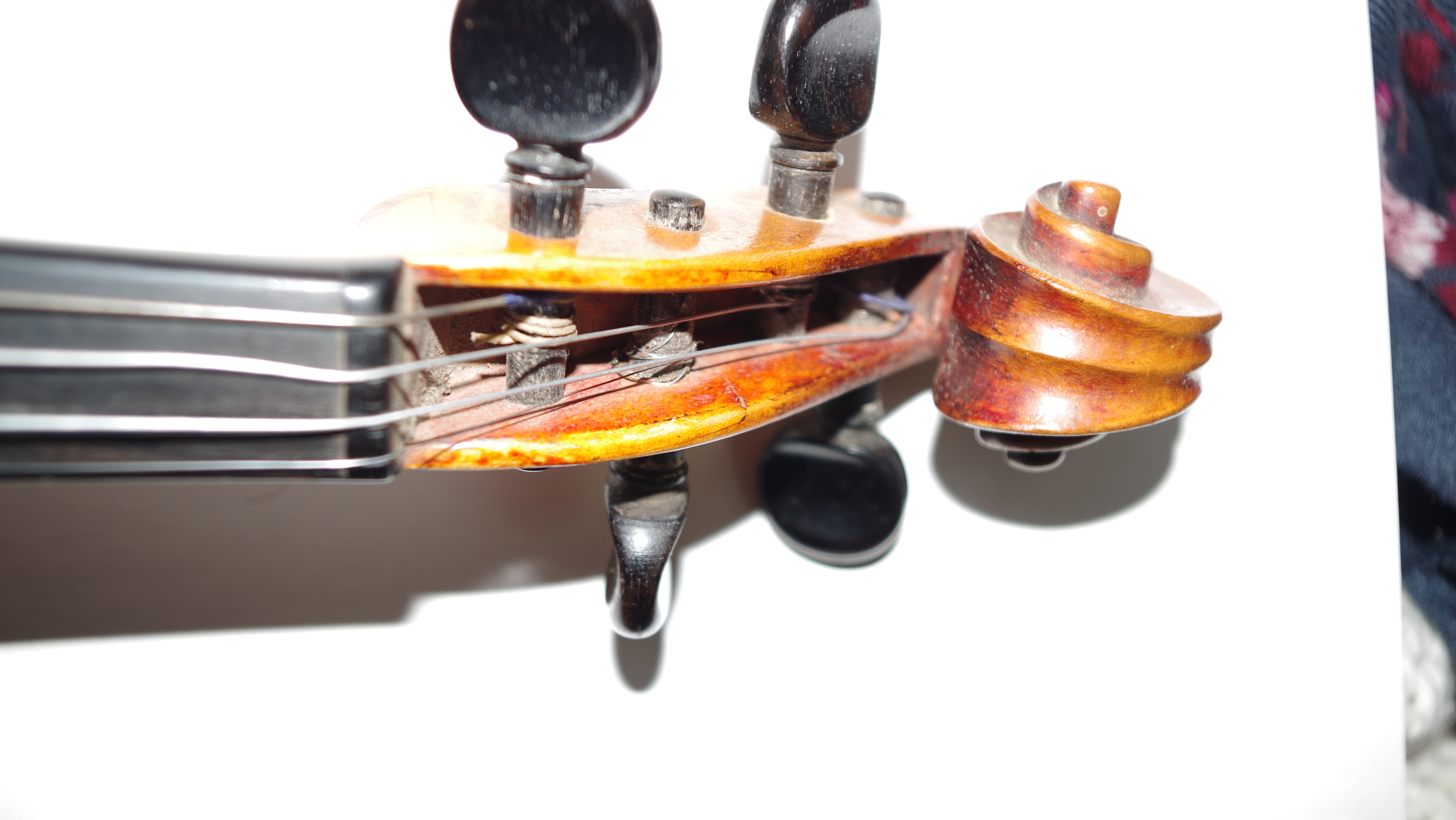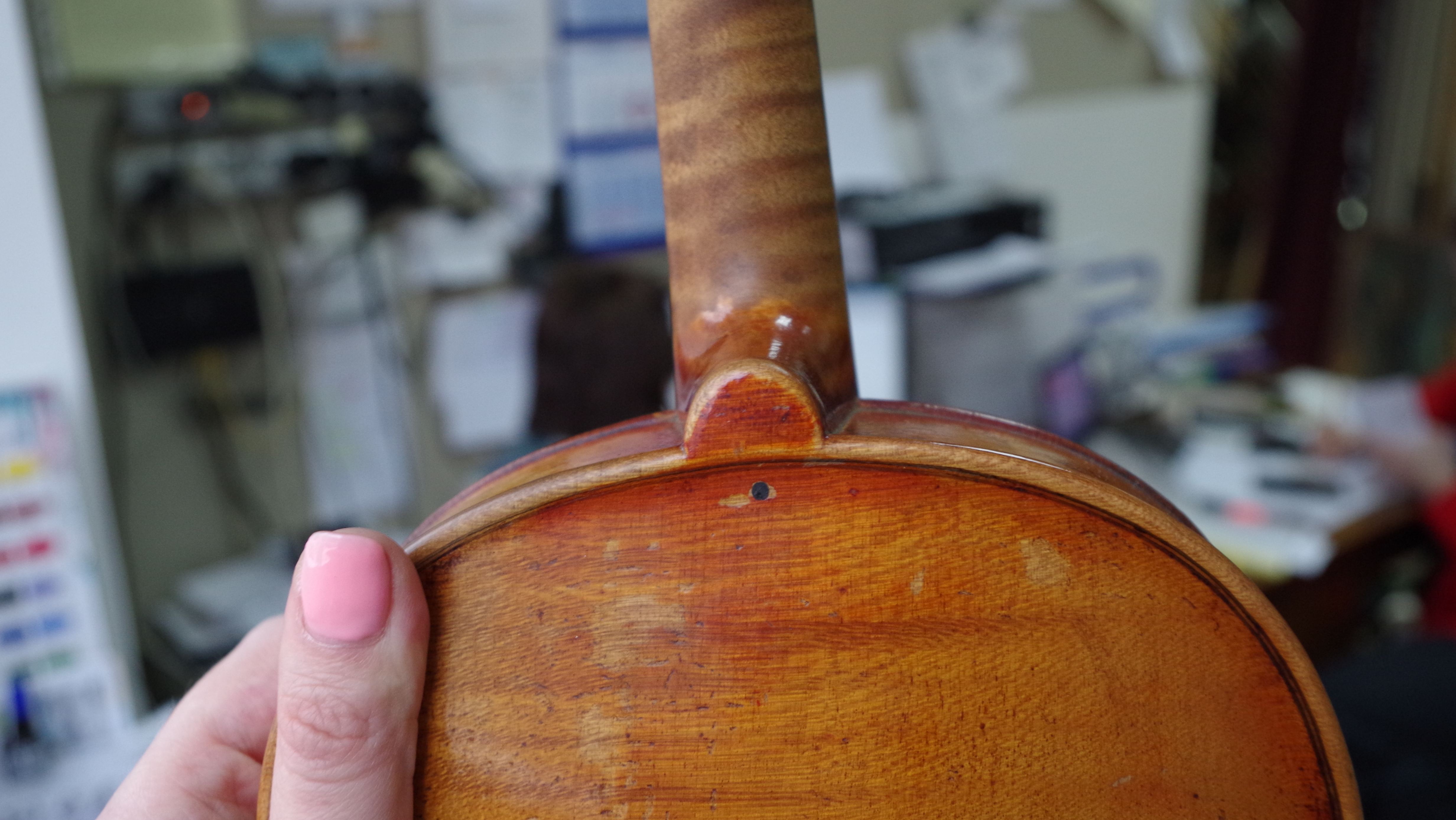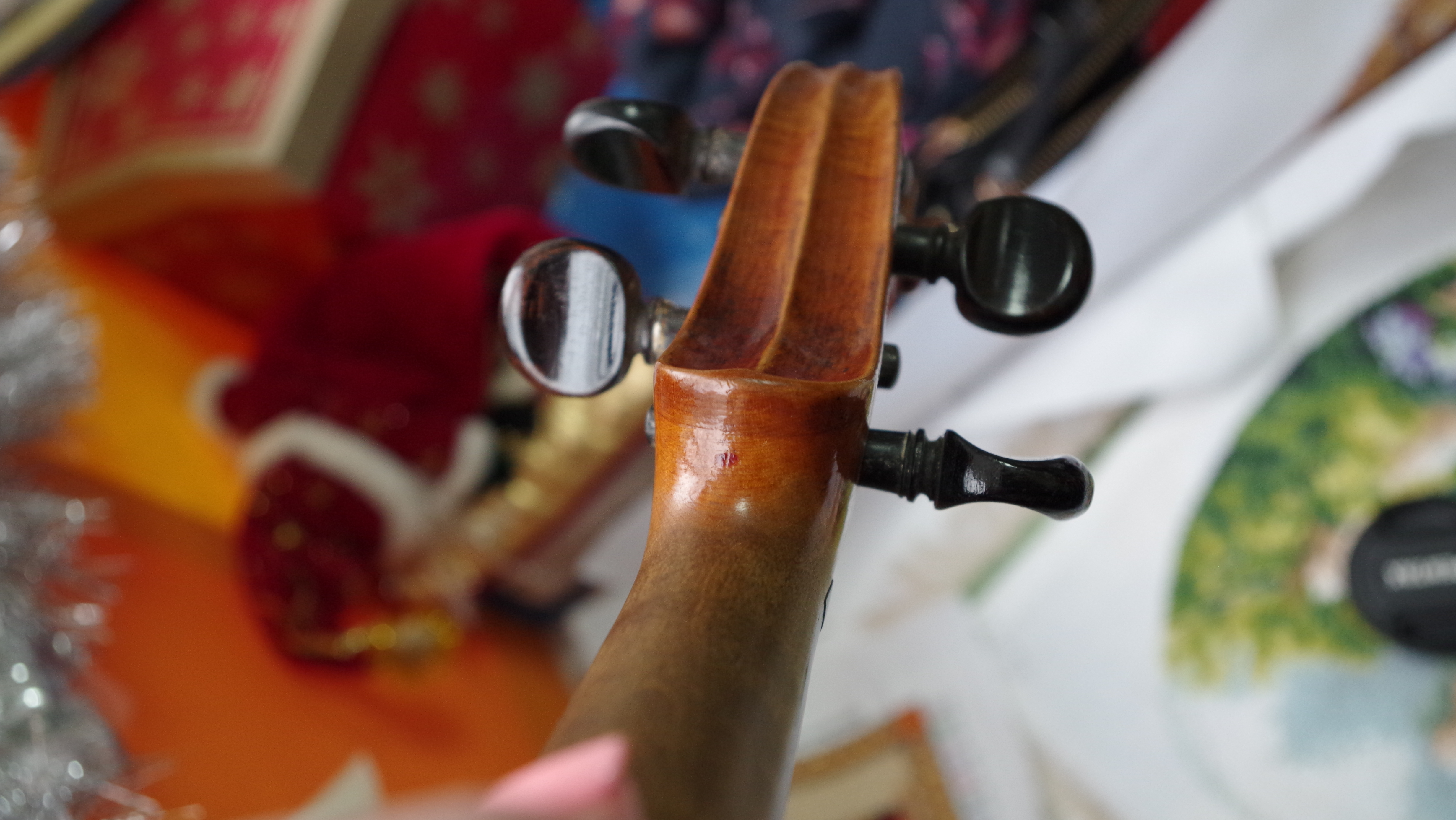 Это не гвоздь (черная точка) А просто что-то врезано. Такого цвета. Это и есть гвоздь, из черного дерева. Цитата: я даже никогда не видела таких тонких соединений, проживших столь долго не рассохшись. Темболее испытывающих постоянный резонанс. Потому что по моему мнению, сложившемуся по этим фото, головка не врезана, а на куске цельного дерева, аккуратненько, тонким инструментом, имитировали врезку. Фото которые на свету, получились гораздо лучше) Скрипка интересная!