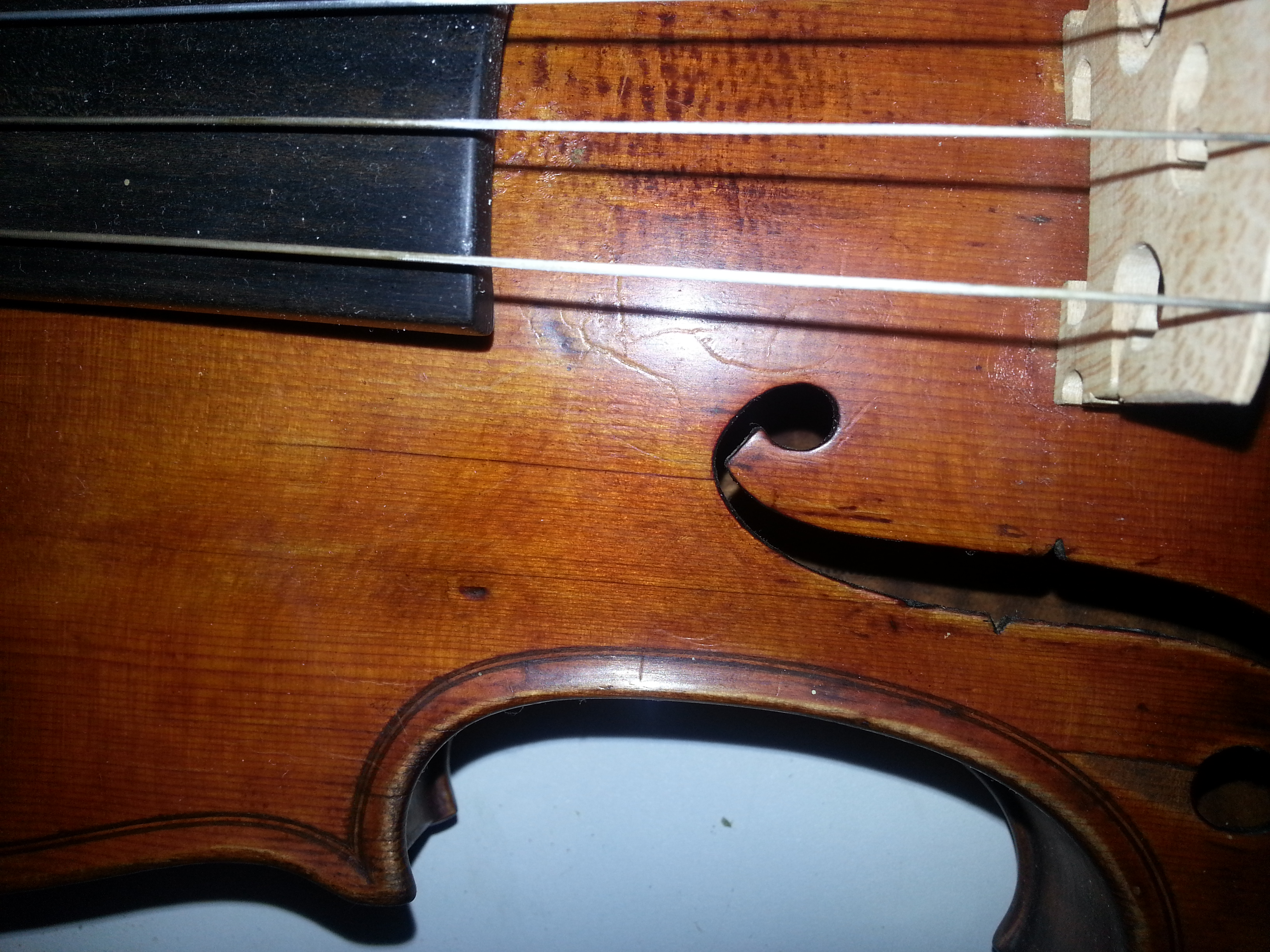 Первое и самое важное по мне. Это натянуть струны и услышать ее. Поеду в нашу консерватрию. Ща знакомая скрипачка рекомендацию даст. Жду. Как покажу скрипку отпишусь. И еще там под пяткой есть пятнышко, как метка. Красноватного цвета. Что это может быть?
