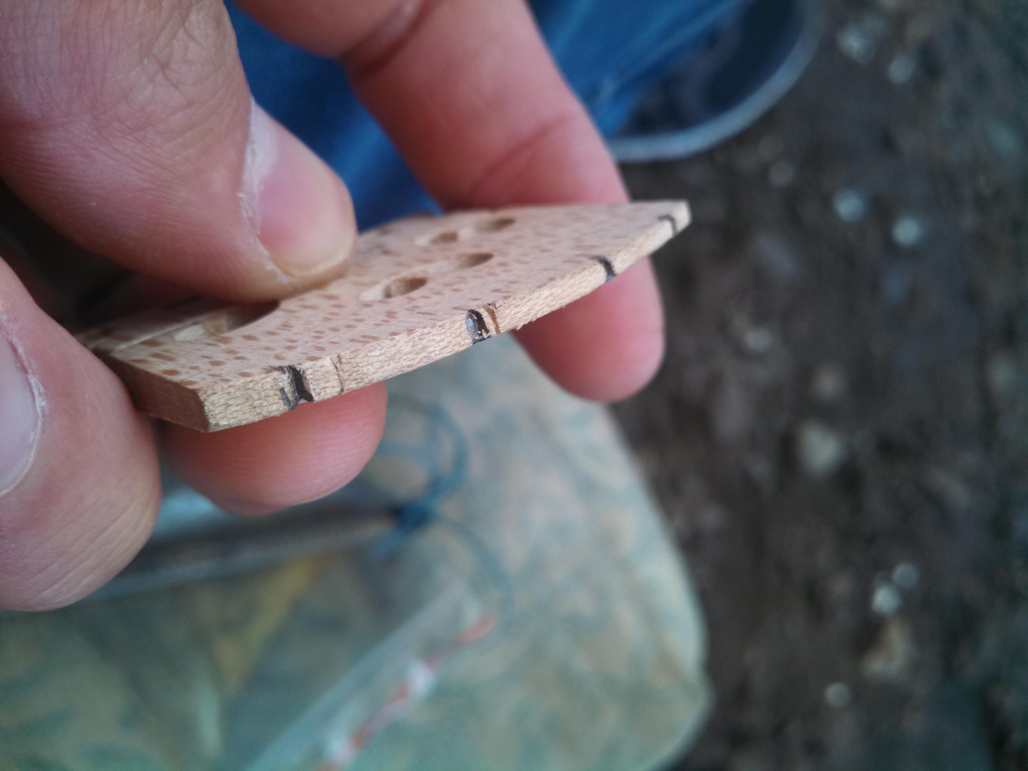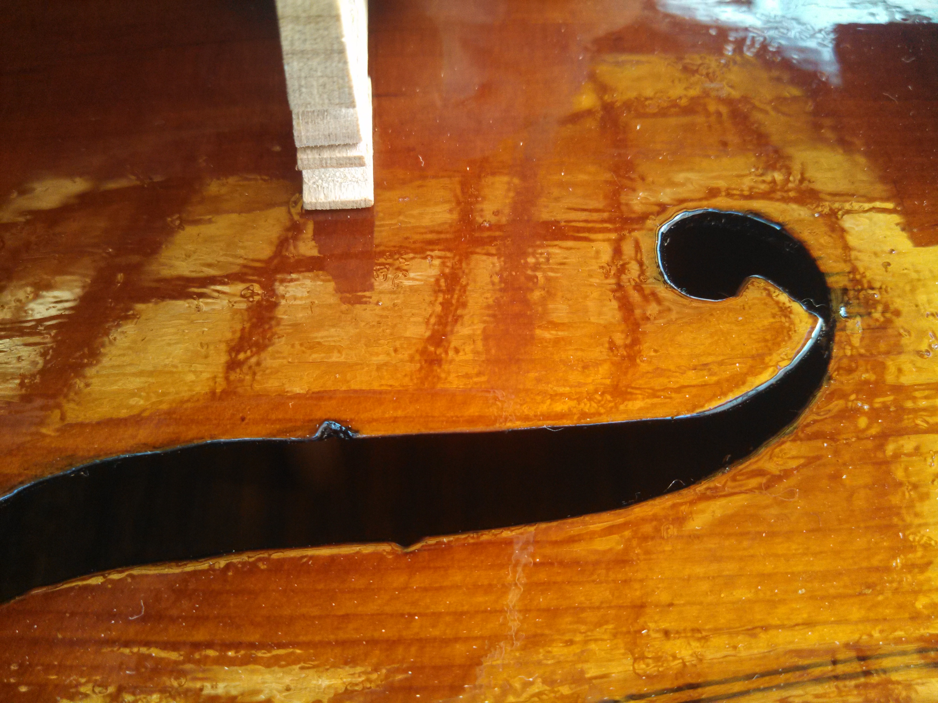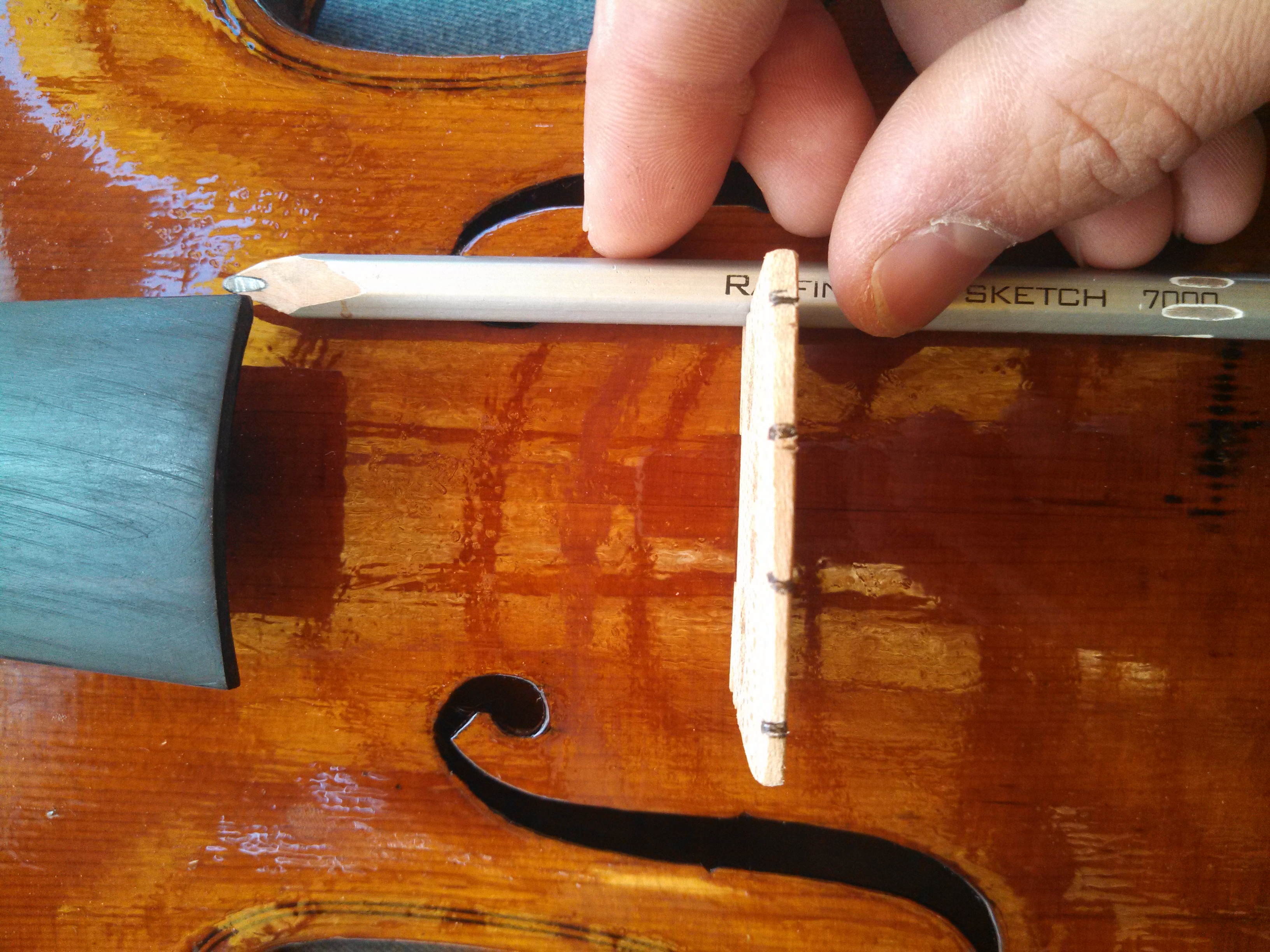 Доброго дня, вибачте за затримку  )) готував фото Одже про підставку 1) повинна стояти рівно лінії зарубків ефів. 2) по цетру між лівим і правим ефом 3) підставка повинна знаходитись під 90 град по відношенню до деки, але зверніть увагу, міряйте кут по задній частині підставки, передню часто скошують майстри(це вже інша тема) Я рівняю зазвичай або по лінії склейки деки по центру, або по верхнім отворам на деці. Ще важливий момент це пуговка яка іноді підчас натяжки (коли струни повністю спущені були) вилітає або виходить.