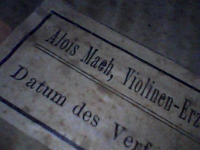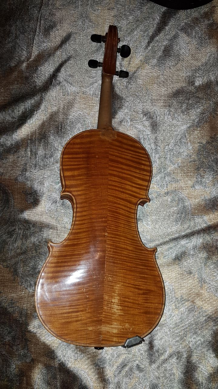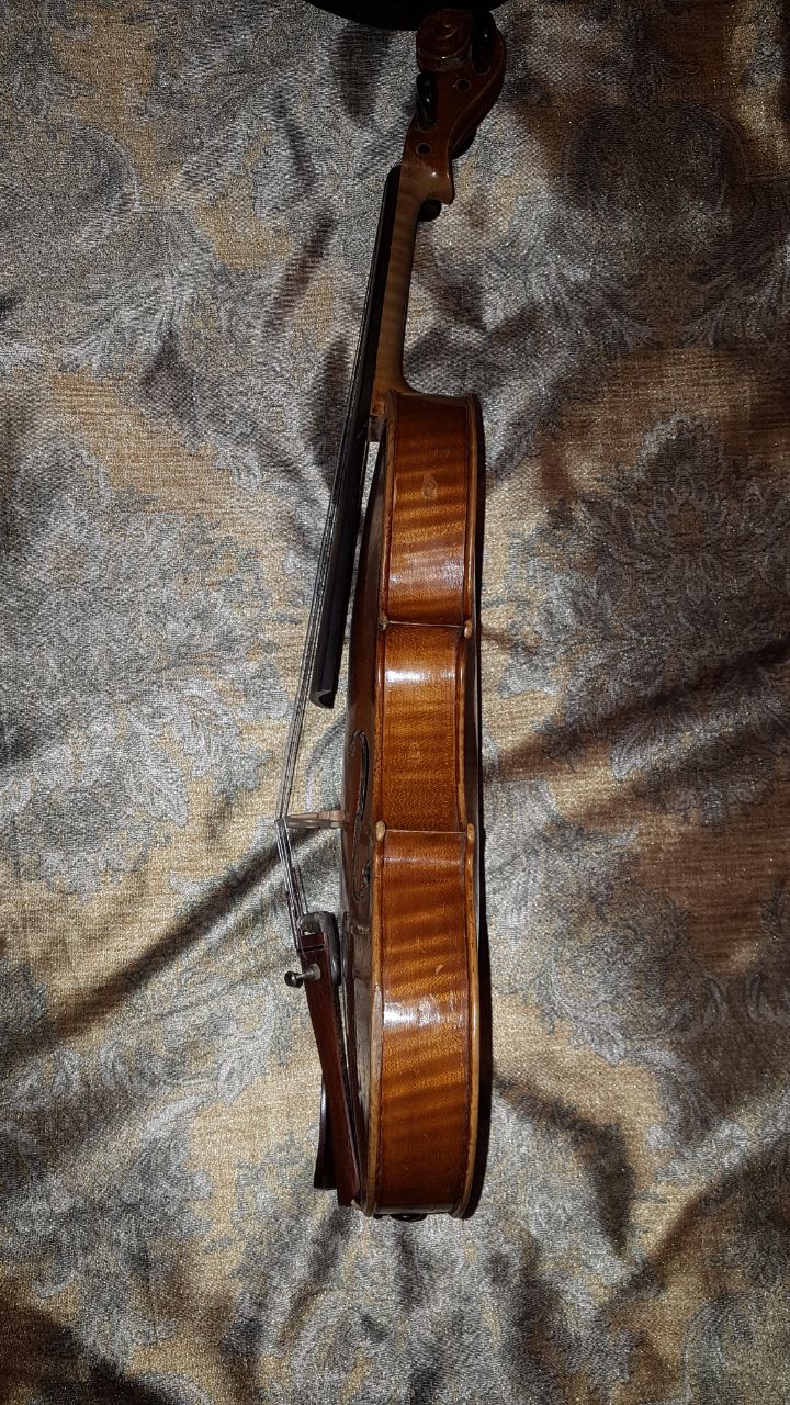 Качественная красивая скрипка. Состояние хорошее. Жаль только, что возле пятки на нижней деке что то скоблили и повредили оригинальный лак. С такого ракурса сложно понять что там происходило и зачем. Скорей всего этикет оригинальный.