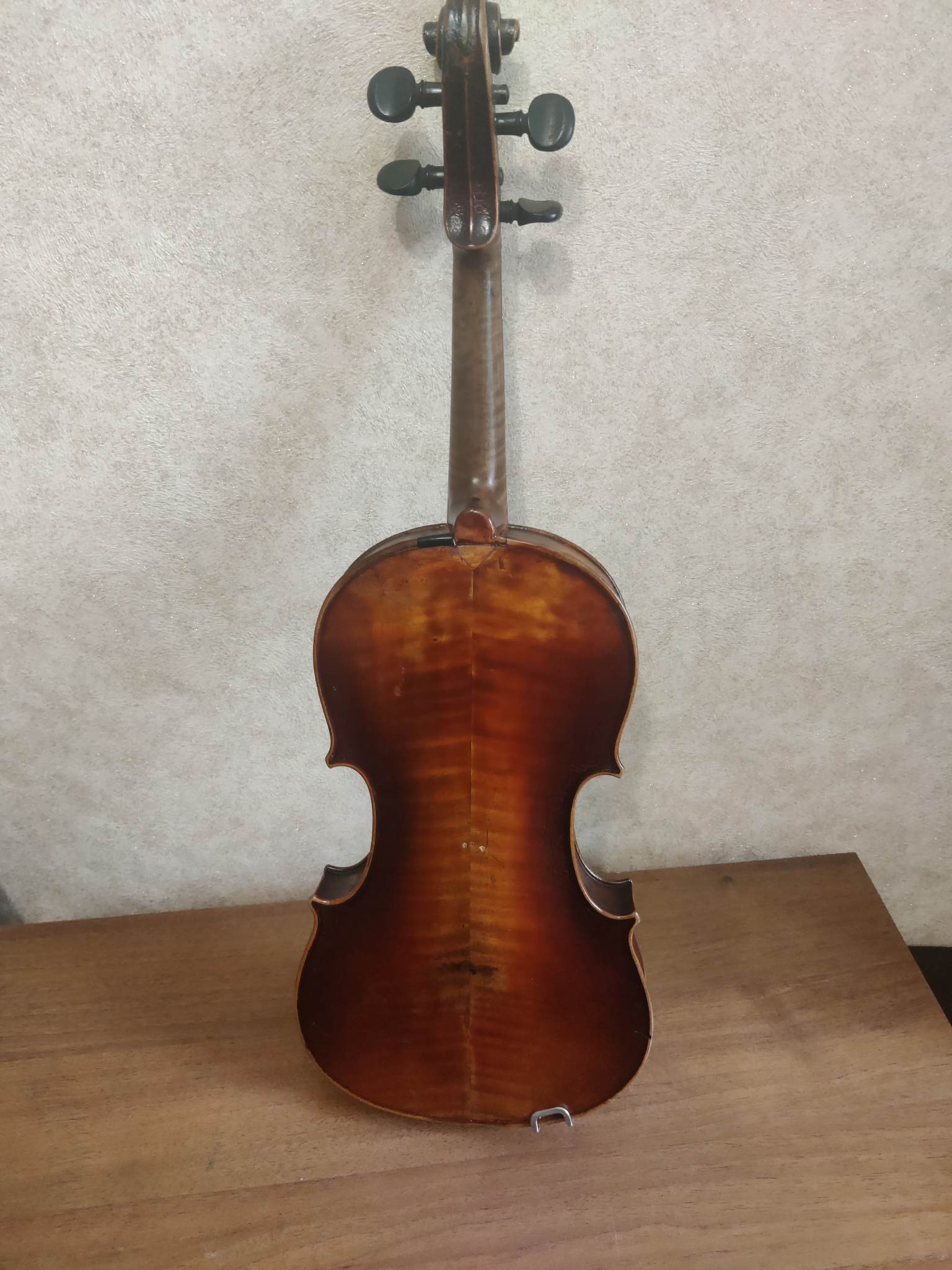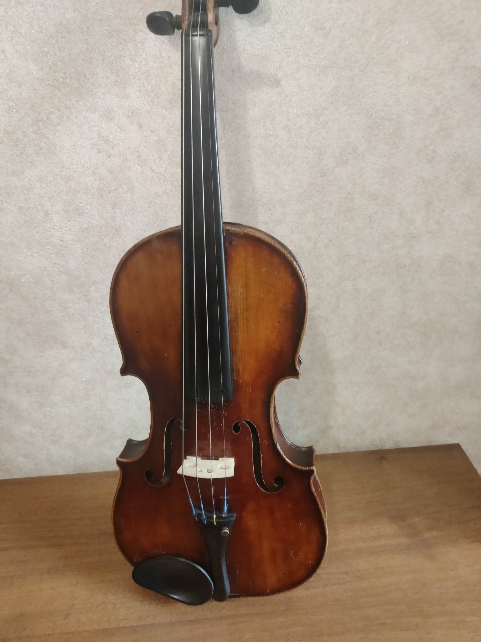 Была привезена прадедом в качестве военного трофея в 1945. Предположительно скрипка мастеровая норманской школы. К сожалению футляр не сохранился так что не совсем понятно правда это или нет так как название производителя было на нем.