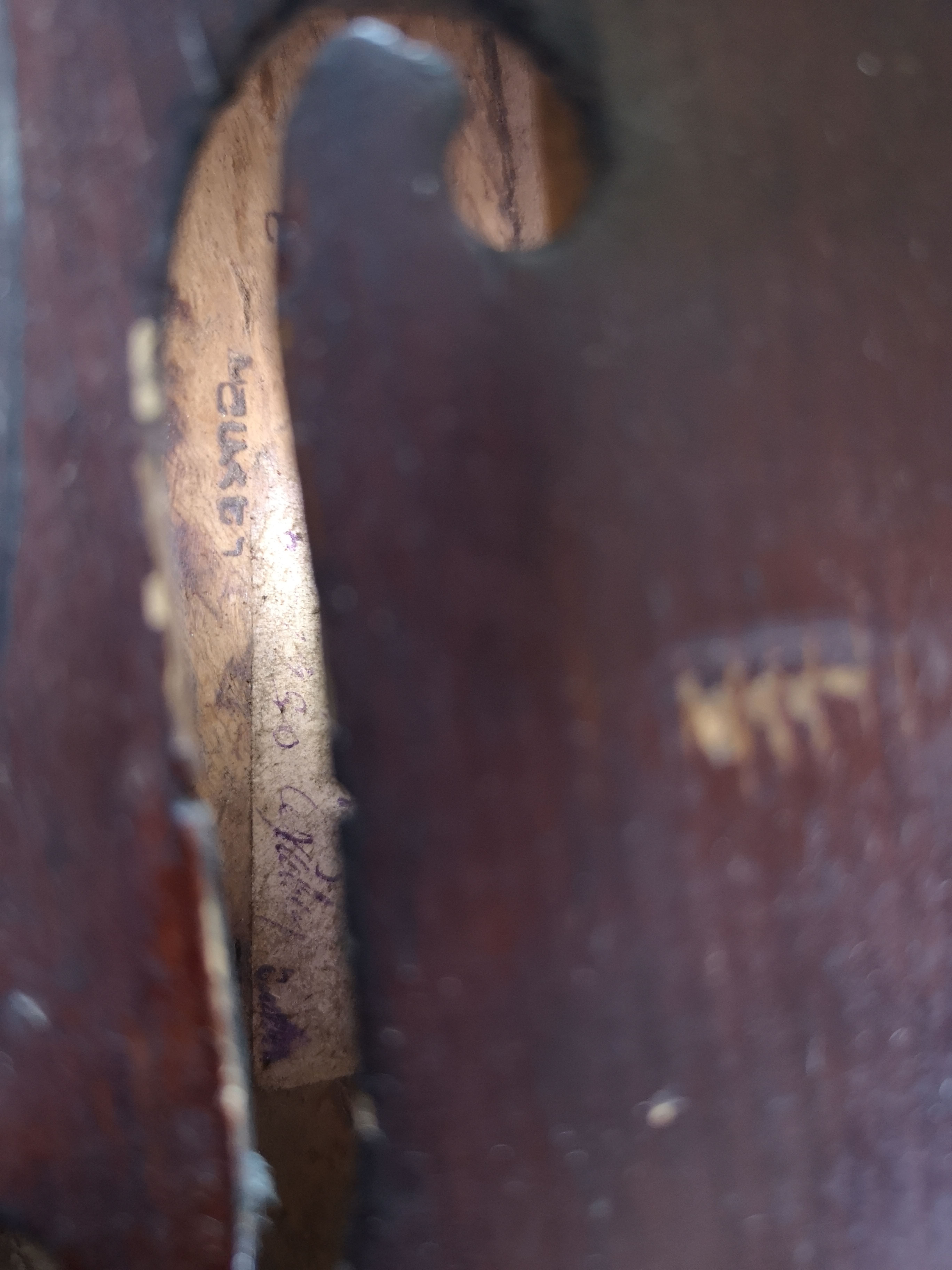 Уважаемые эксперты, к сожалению по факту только остатки этикета, на котором просматривается 1930 год и подписи. Между остатками этикета два клейма, как Вы правильно указали имени " Шаген". Хочется верить, что скрипка- дело рук мастера Шагена Эрицяна, который начал профессионально создавать скрипки с 1928 года. Спасибо, за профессионализм, надеюсь на Ваш окончательный вердикт.