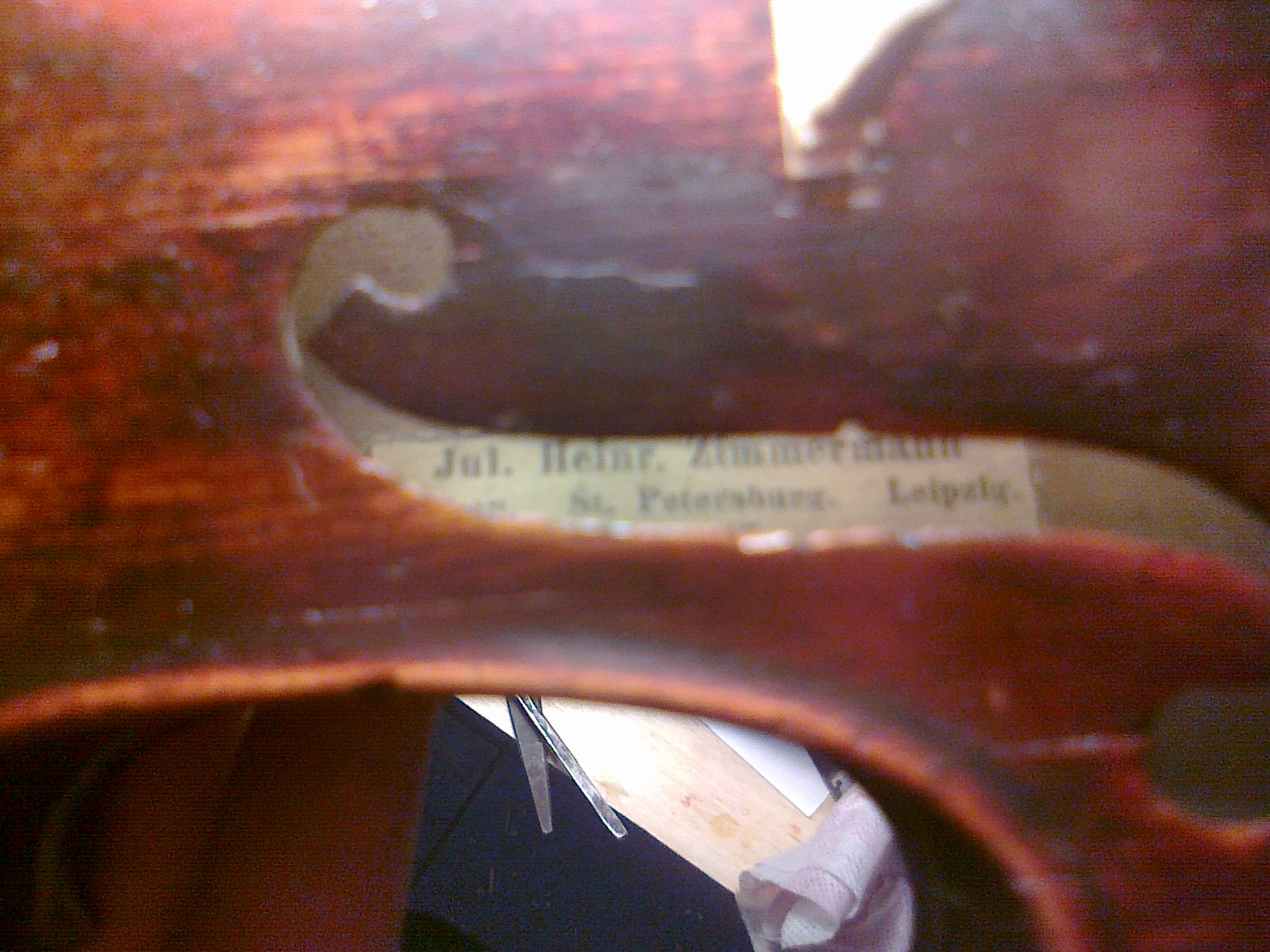 Скрипка 3/4 неизвестного происхождения, хотелось бы узнать ее стоимость. Внутри этикетка "Jul. Heinr. Zimmermann Moskau. St.Petersburg. Leipzig. №114" Извиняюсь за качество фото.