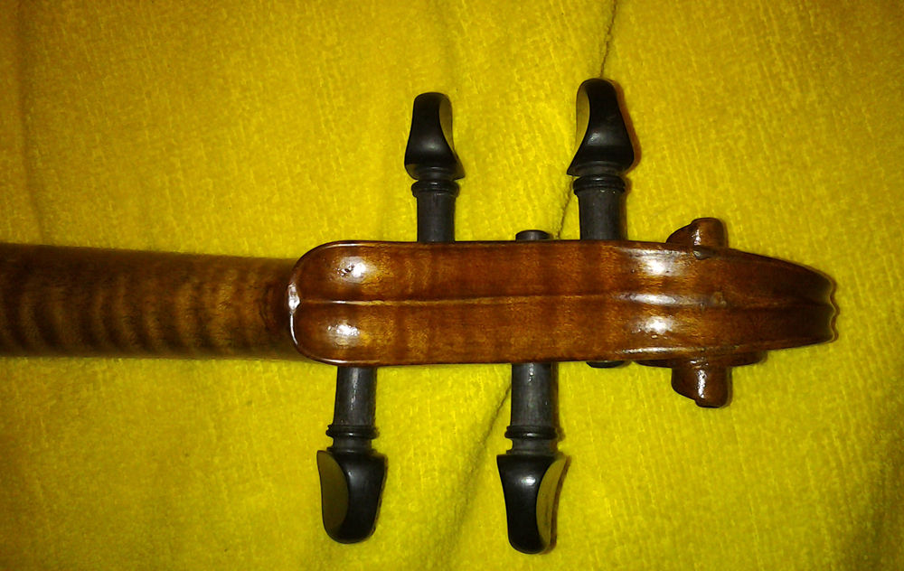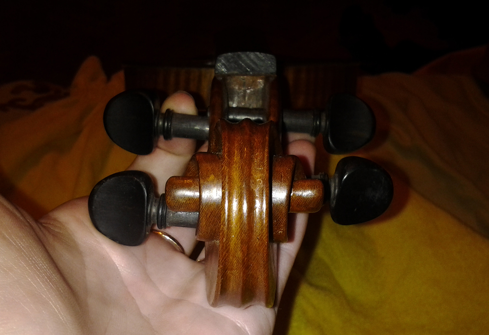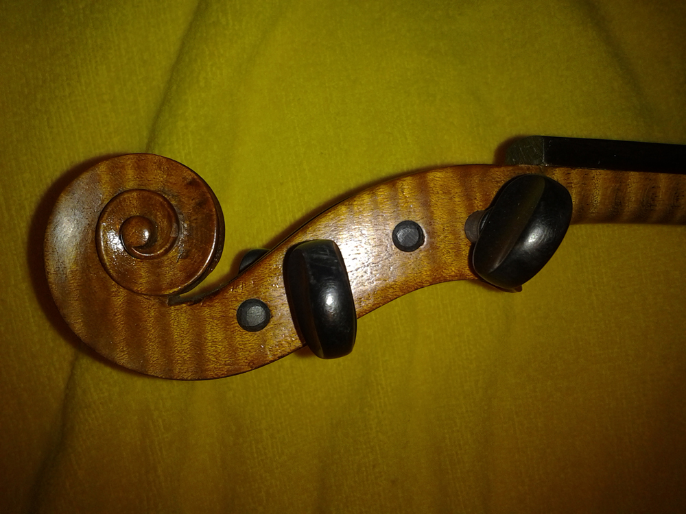 Звук, по крайней мере когда я еще на ней играла, 6 лет назад, был глубокий и мягкий, это было хорошо слышно при сравнении с ученическими скрипками советского производства, а про трещины - не заделанных нет, все фотографии увеличиваются, на них видно, задняя дека у шейки одна, и у пуговицы.