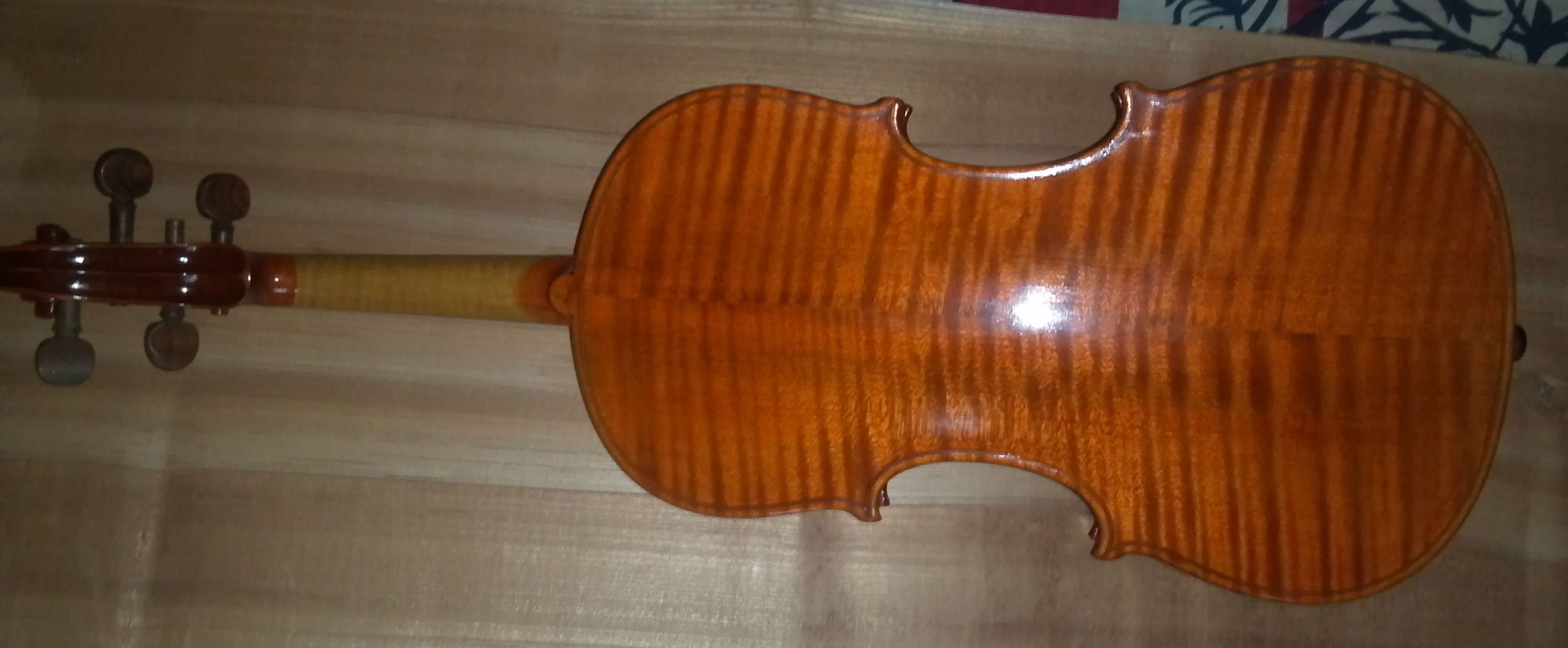 Возможно мастеровой инструмент. Лак не выглядит старинным. Либо перелакированная скрипка, либо действительно не старая. Не понятно почему инструмент так плохо смонтирован. Ужасный подгрифник и колки. Высота подставки и угол грифа тоже вызывают беспокойство.