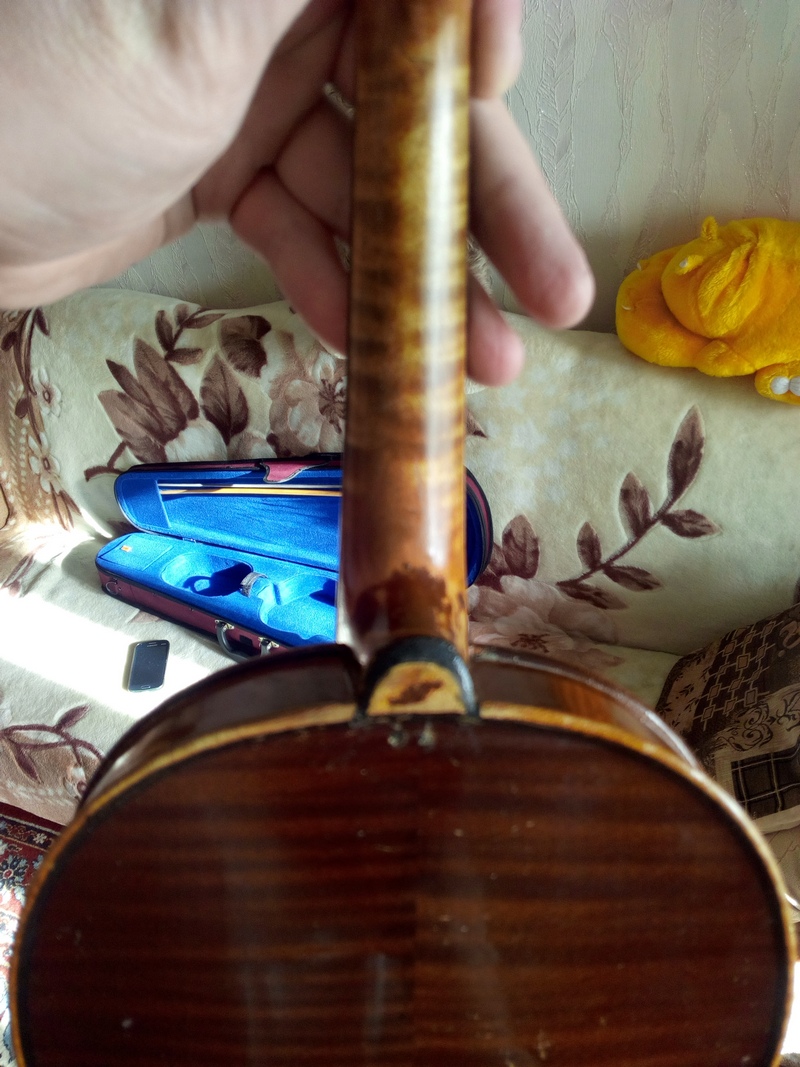 О состоянии по имеющихся фото: сбивайте цену за то, как вставлена шея. Два деревянных гвоздика там не для декоративной цели. Скорей всего шейка выпала вместе с кусоком нижней деки именуемым пяткой. Потом шею вклеили и укрепили этими гвоздиками вставив их по диагонали. Инструмент не особо ценный, но все равно это нарушение технологии подобного ремонта. Минус в состоянии скрипки.