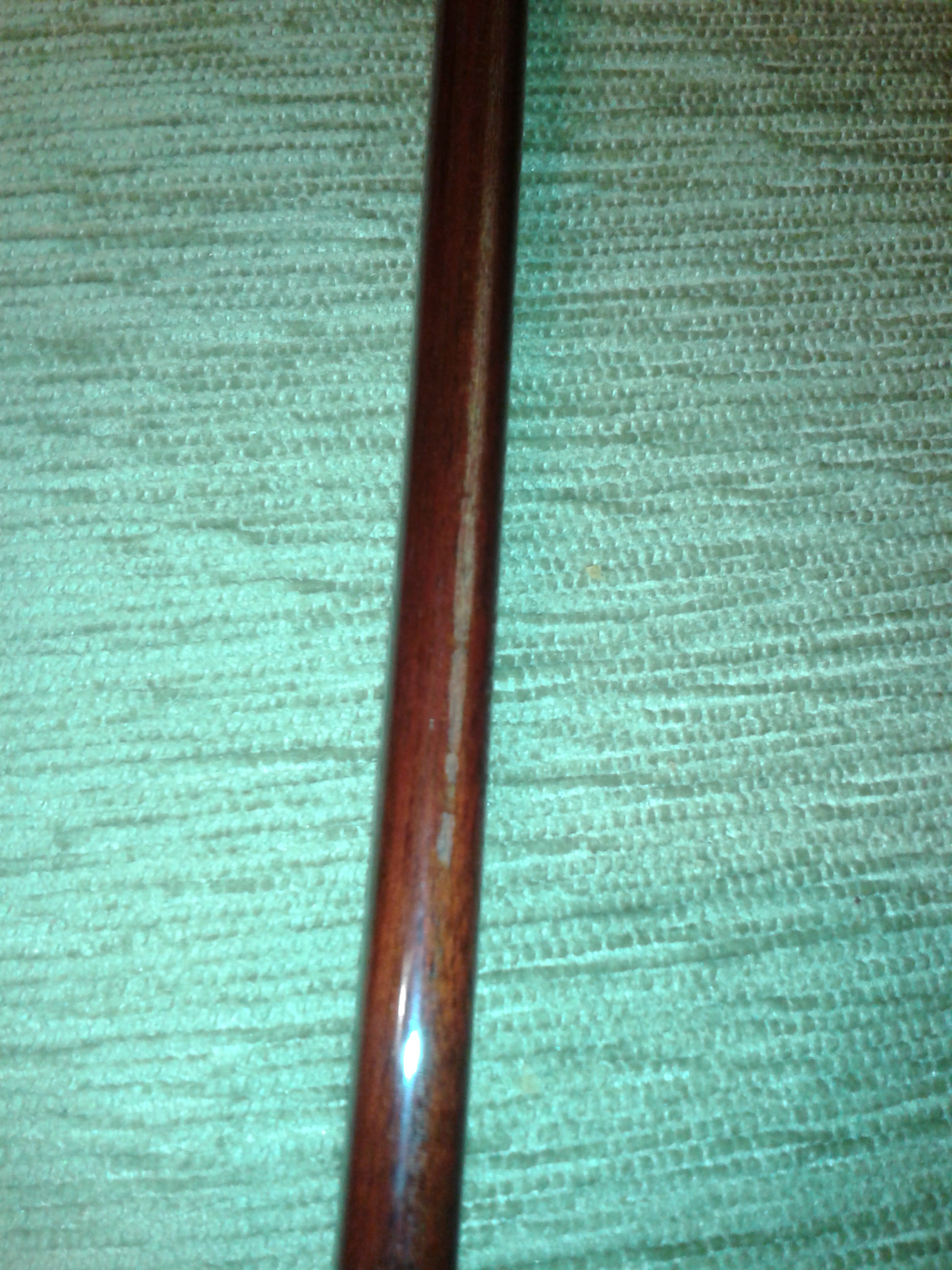 Сегодня после занятий пришла в ужас, обнаружив, что на смычке повредился лак! Не знаю как это могло произойти. Смычку полгода. Ежедневно протираю тряпочкой от канифоли. Дважды чистила средством Petz rosin remover. Последний раз чистила пару недель назад, но ничего подобного я не замечала, поэтому не уверена что это причастно к повреждению. Возможно каким-то образом зацепила трость во время того, как канифолила волос? Но опять таки, не понимаю как такое могло случиться, стараюсь всё делать аккуратно. Лак повредился в месте, где обычно скапливается наибольшее количество канифоли, ближе к колодке.