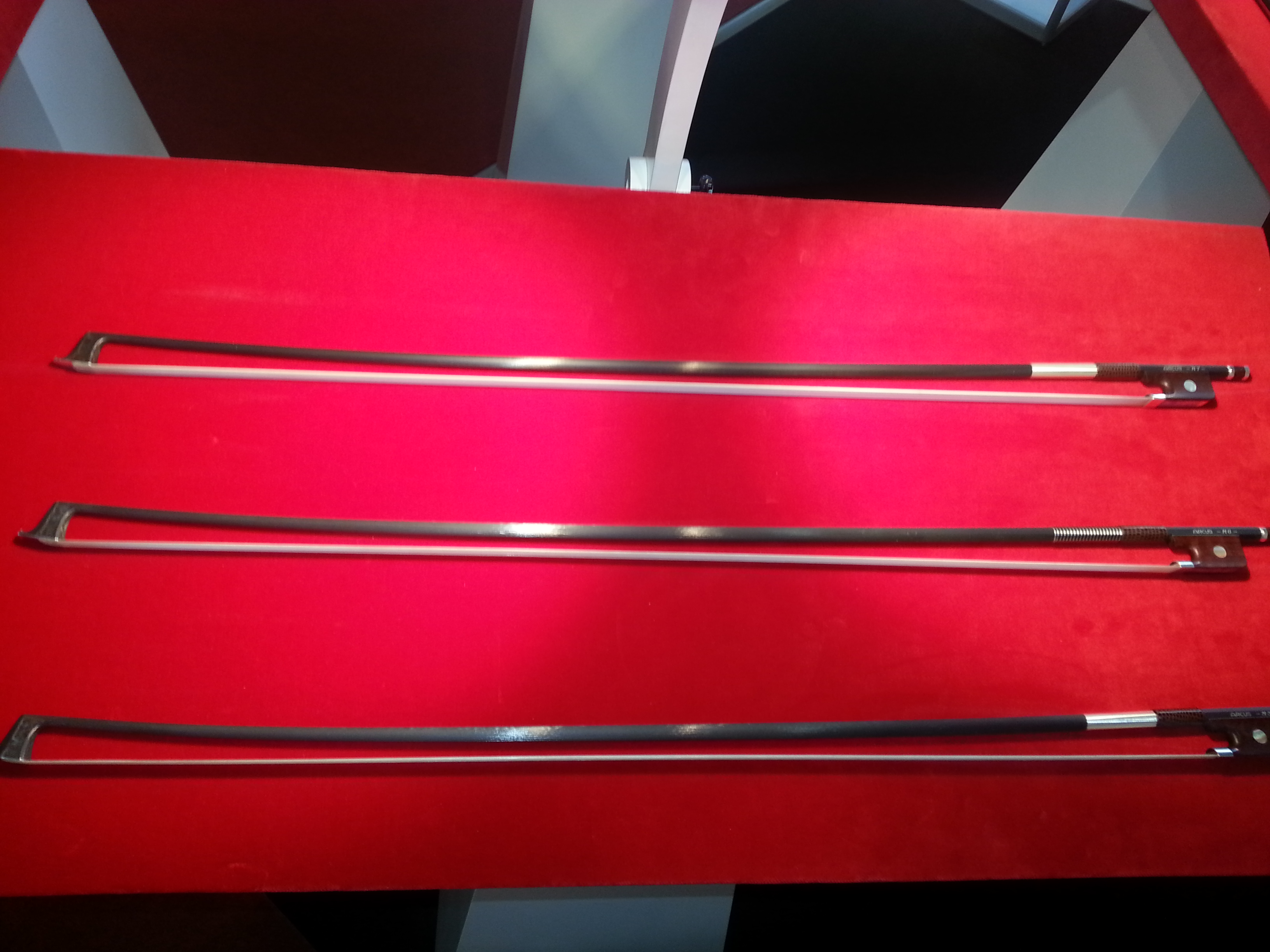 Игровые качества дешевых карбоновых смычков оставляют желать лучшего, а вот смычки подороже меня удивили на Мюзик Мессе. Музыканты прожужжали все уши по поводу дорогих углепластиковых смычков и как раз предоставилась возможность убедиться в этом лично. Фирма Arcus давно специализируется на производстве смычков из углеродного волокна. Ну что я вам скажу...хорошие смычки. Сначала не привычно, потому что вес не соответствует привычным стандартам. Но штрихи, устойчивость, баланс...Только стоят от 1000 у.е.