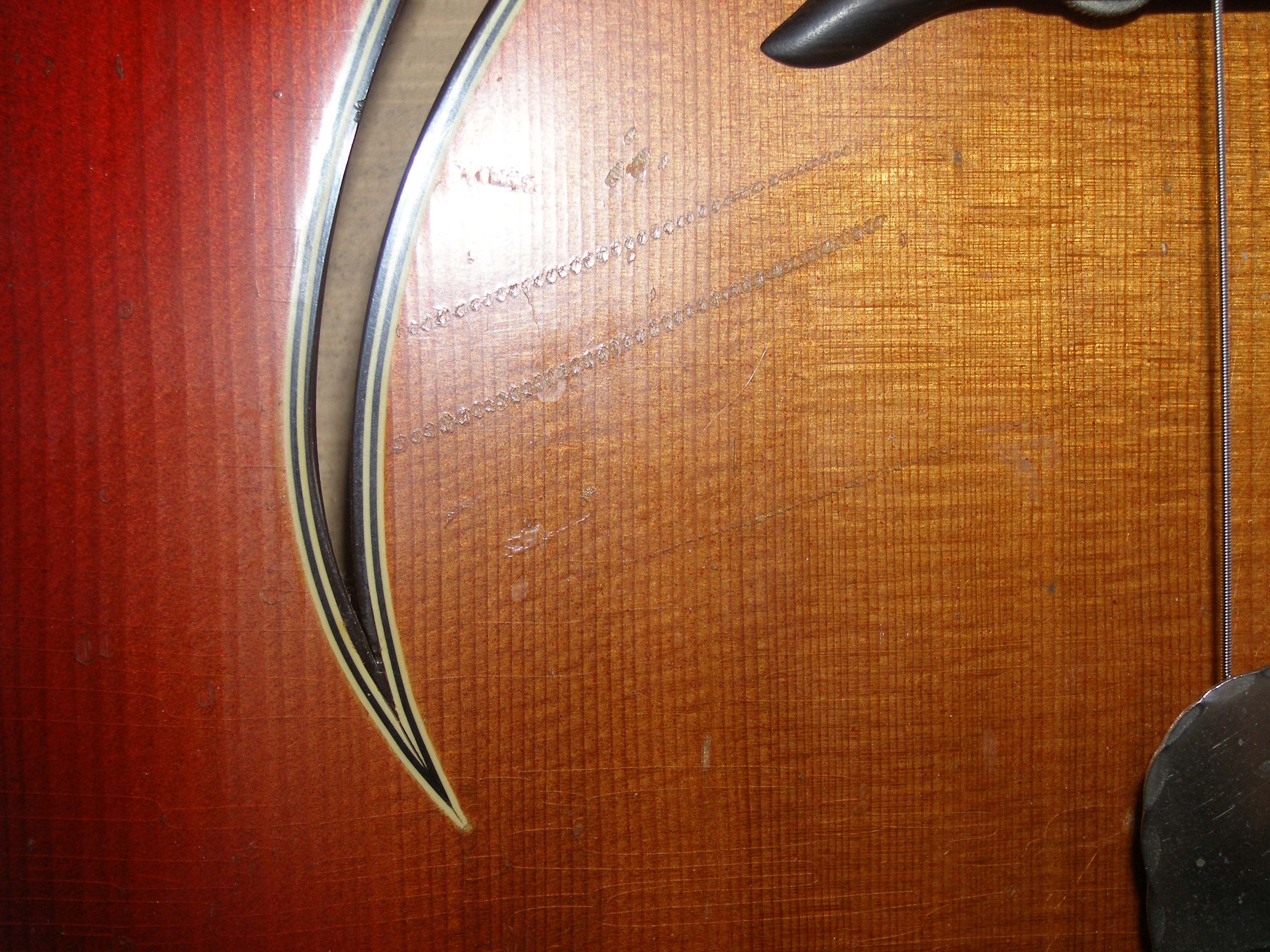 На втором фото ещё не сделаны отверстия для звукоснимателей, делалась реставрация, и в процессе реставрации старые отверстия пришлось заклеить вставками дерева, позже естественно они там были сделаны и установлены датчики.