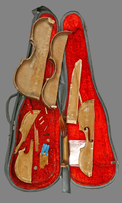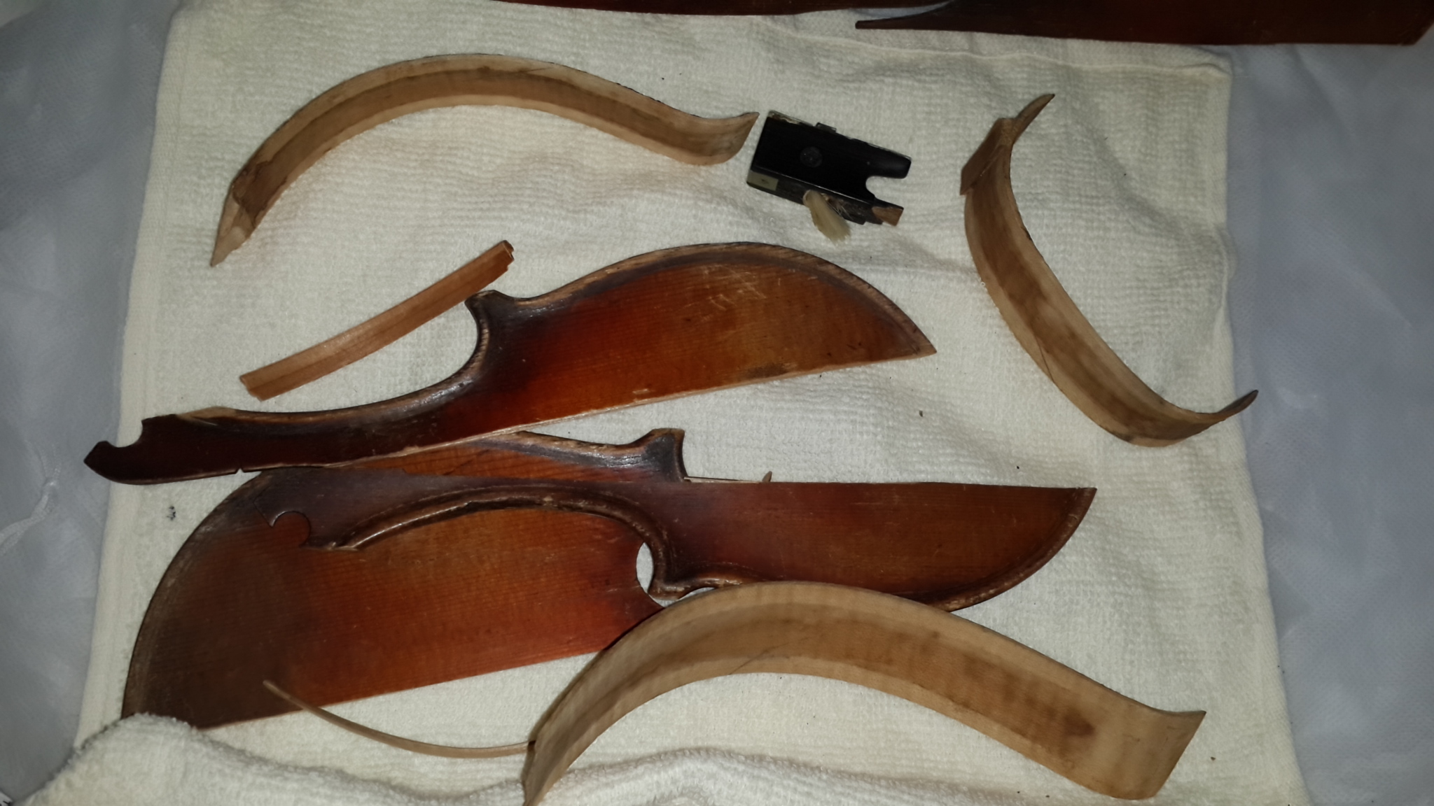 Вот скрипка, на которую сели... Сейчас на ней успешно играют, правда пришлось немного притемнить лачок по просьбе хозяина. Трещины, которые заметны в основном старые, ново образовавшиеся как раз не особо видны. Инструмент представлял ценность для семьи владельца как память, поэтому было принято решение чинить, а не искать новый инструмент.
