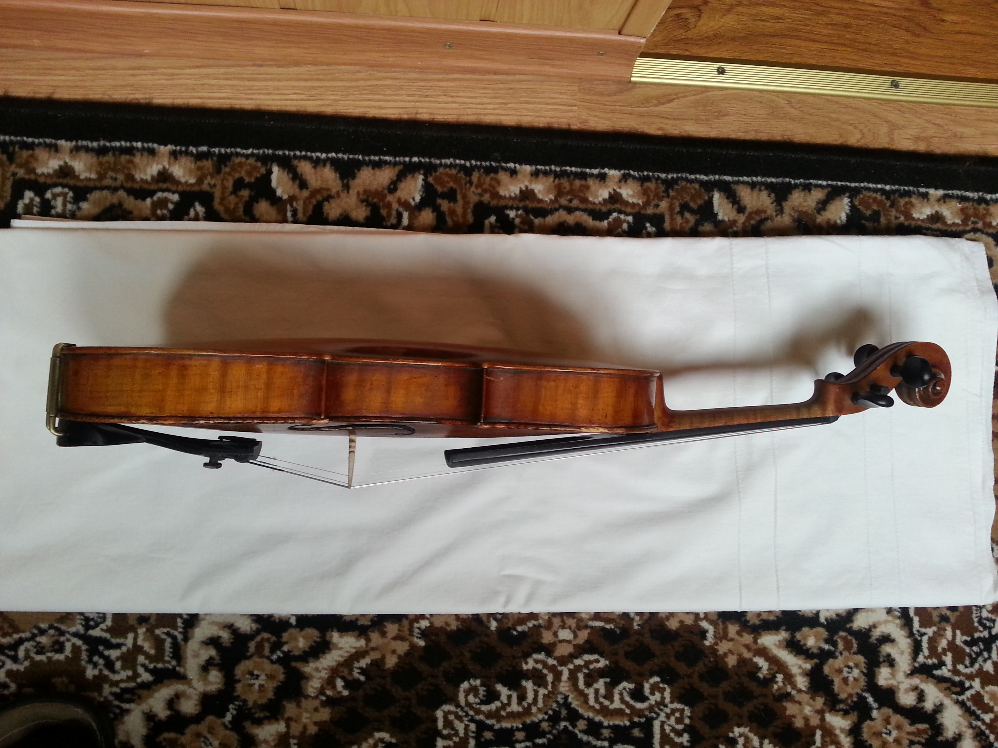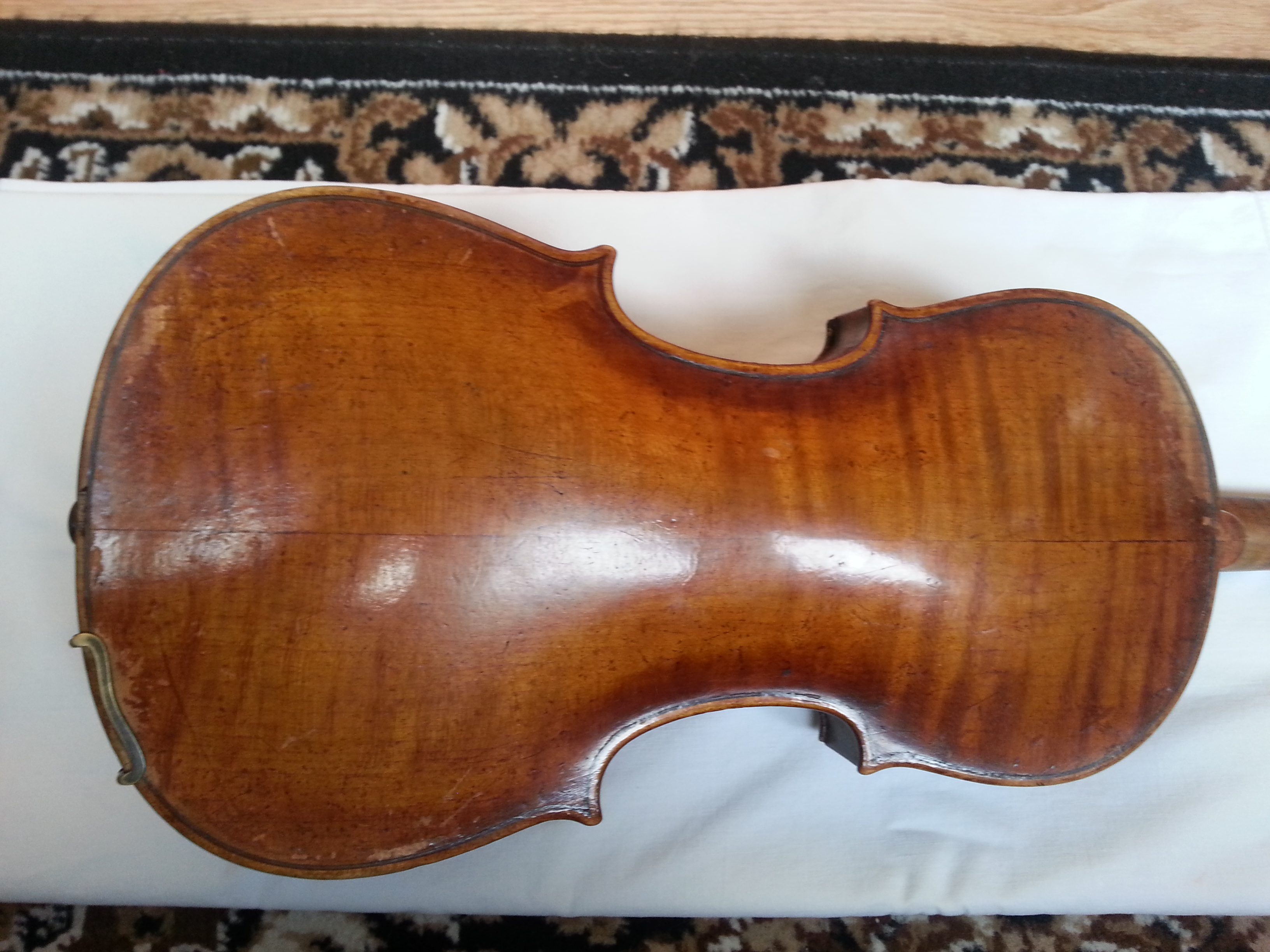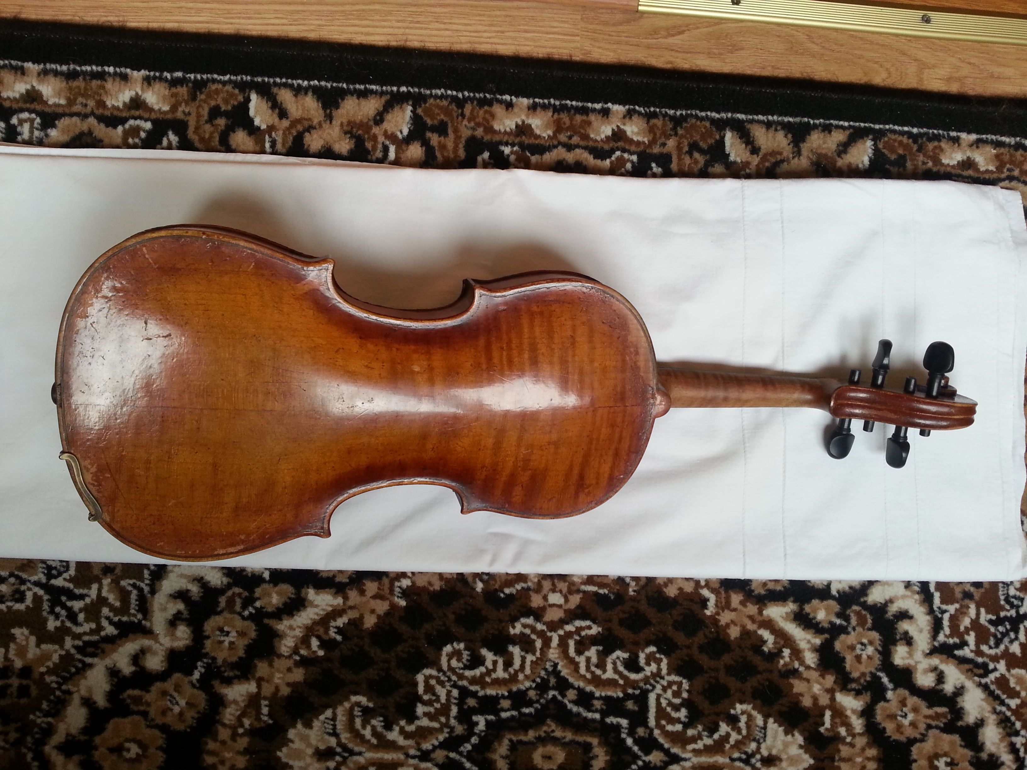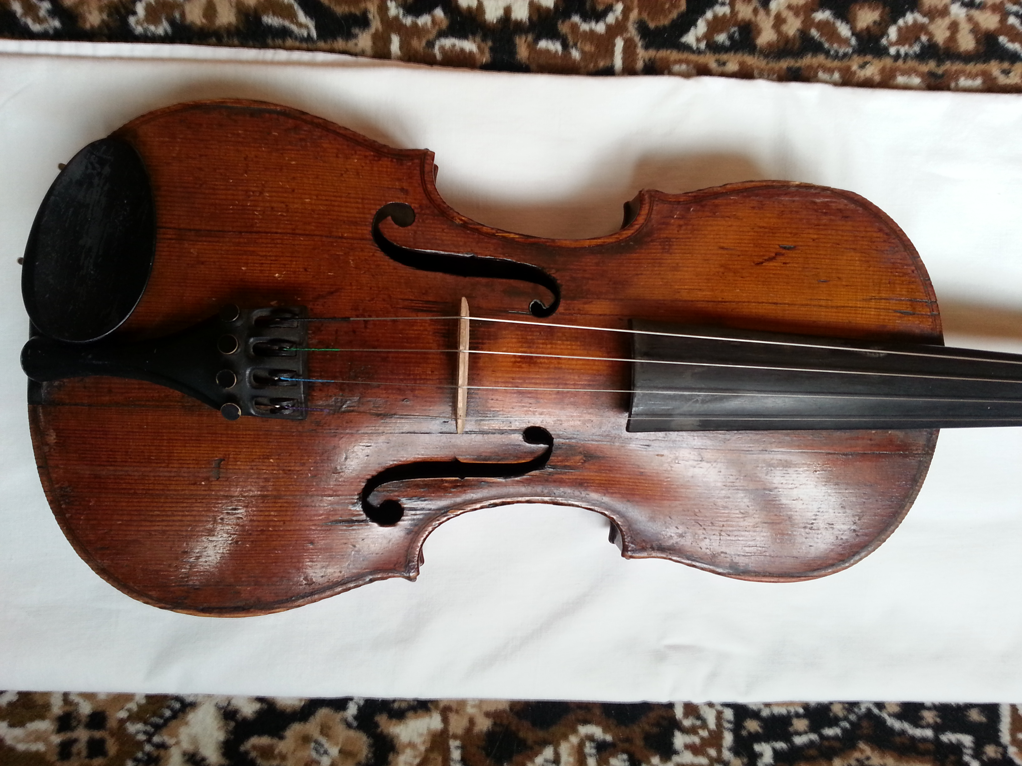 Скрипка симпатичная. Может быть и возраст верен. Трещины есть, но не смертельные. Но склеены не все хорошо, насколько мне видно. А видно не очень... В общем, нужно для страховки показать мастеру, не ходят ли трещины, выбросить ужасный металлический подгрифник, поставить нормальные струны и вперед.