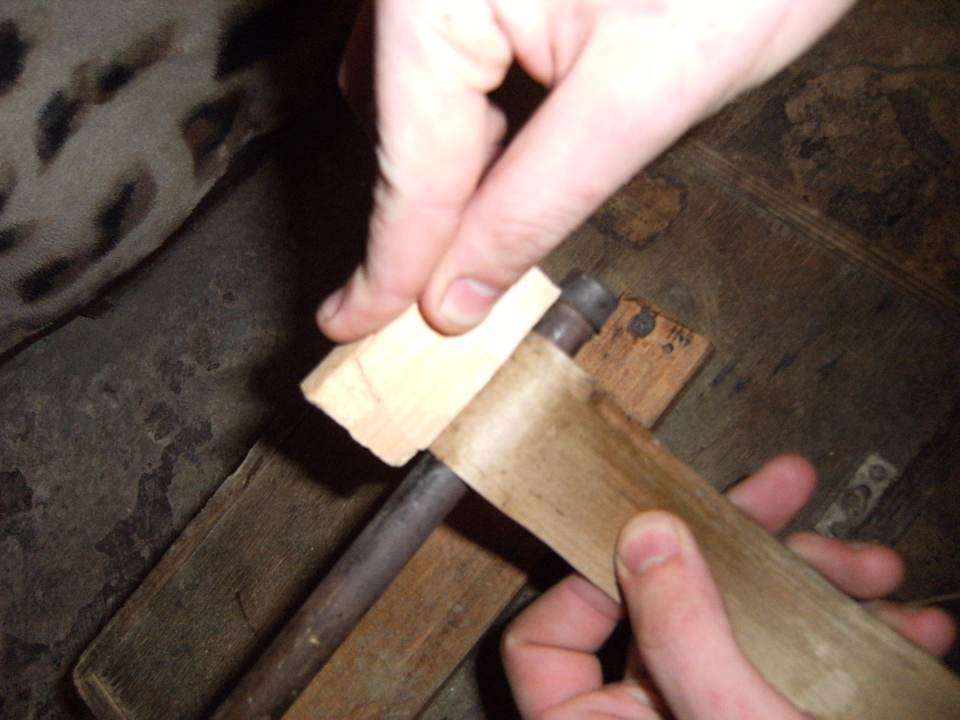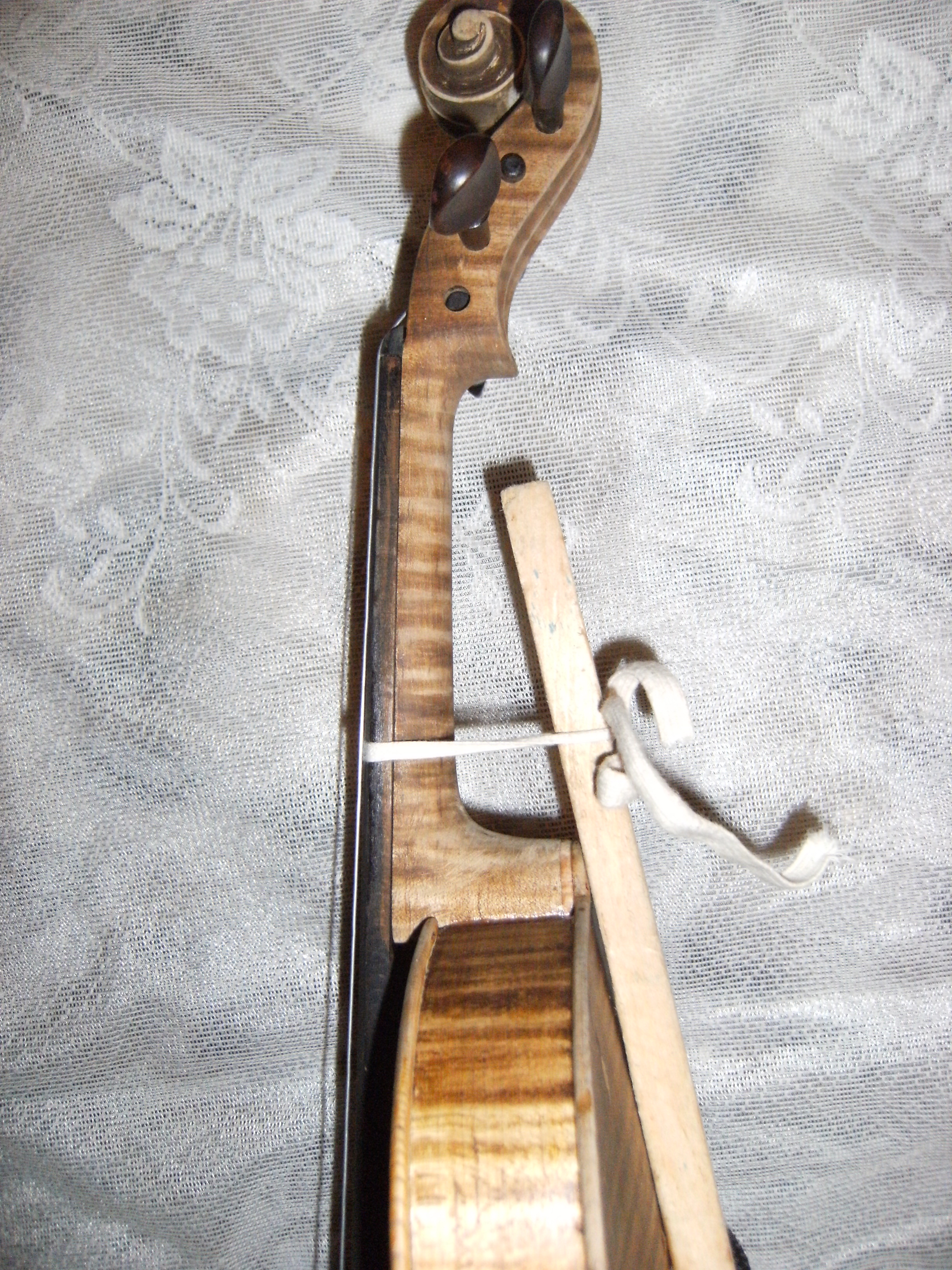 Бывает в жизни скрипки такая неприятность:отклеилась голова.А Вы живя в провинциальном городке не имеете доступ к квалифицированным мастерам.Можно купить девайс на ибей за 20 долларов но он приедет только через месяц а ремонт нужно осуществить срочно.На фото пример того как оперативно приклеить головку без особых ухищрений, с помощью палки и двух веревочек.Понадобятся еще две струны которые не жалко.К палке притягивается головка а струны создают противовес.Подставка должна быть подогнана +1 миллиметр.После высыхания подставку можно подогнать окончательно.клей должен сохнуть не менее суток.(клей мездровый,костный без добавок).
