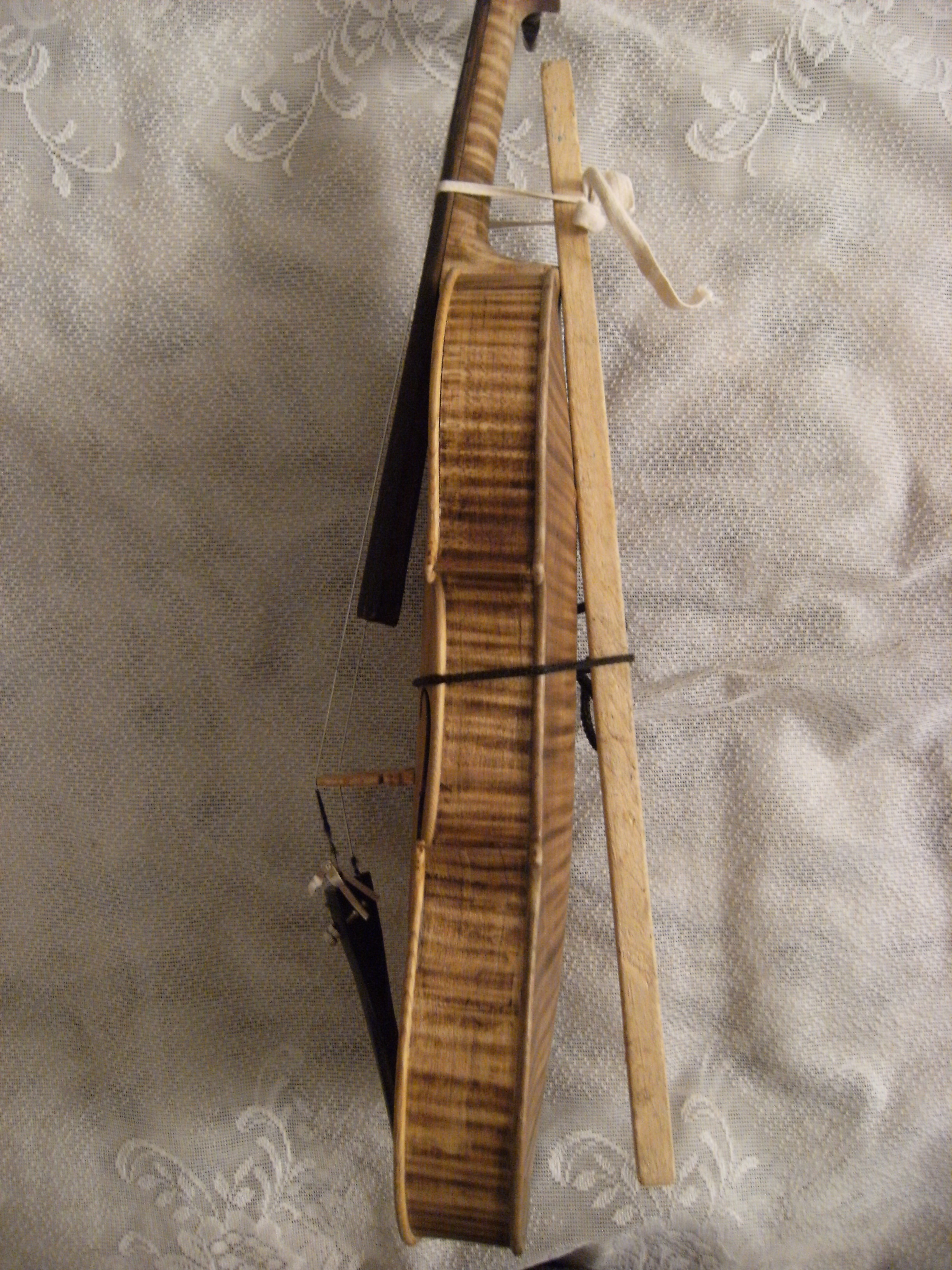 Скрипку сняли с крепления и перед тем как лакировать прослушали с дешевыми струнами.Грунтовка и лакировка значительно улучшают качество звучания,если все проделать грамотно.